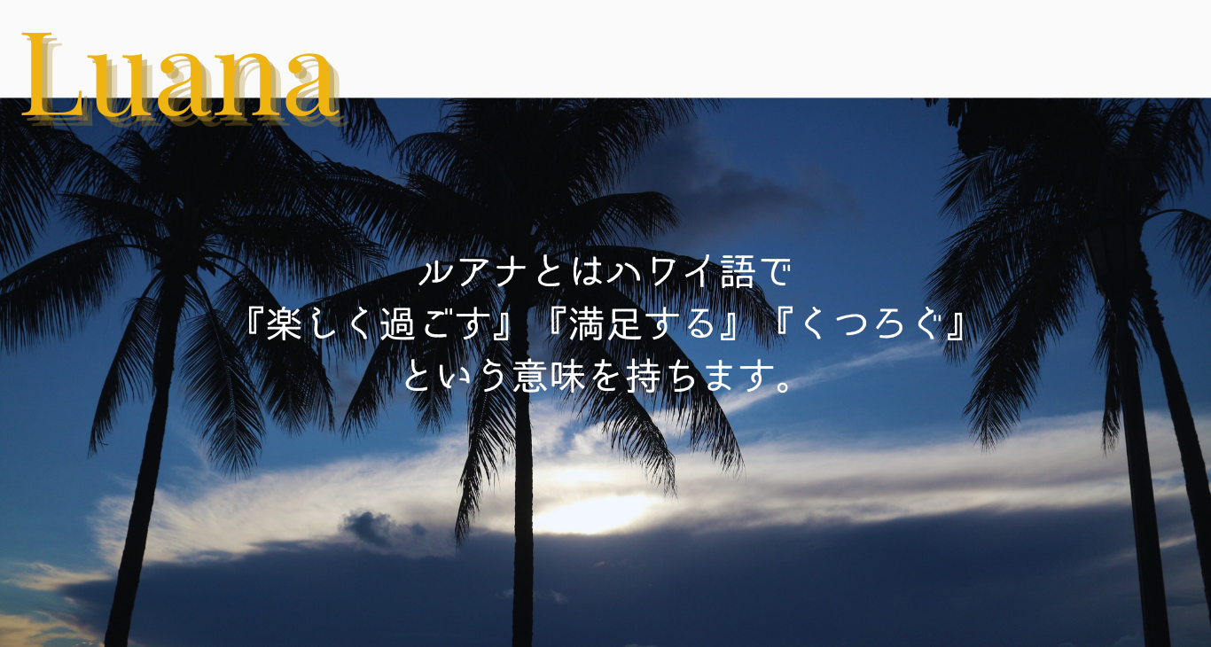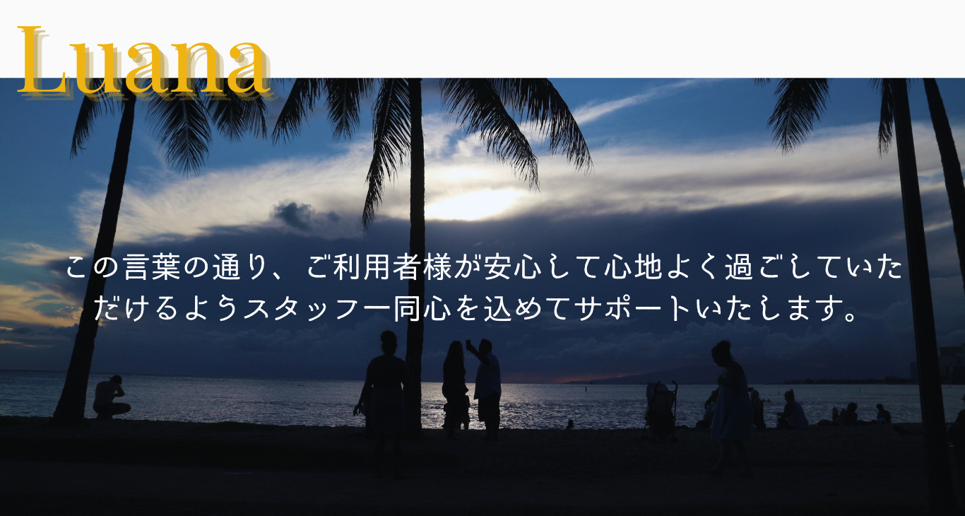 『ルアナ(Luana)』とはハワイ語で、『楽しく過ごす』『満足する』『くつろぐ』という意味を持ちます。この言葉の通り、ご利用者様が安心して心地よく過ごしていただけるよう、スタッフ一同心を込めてサポートいたします。